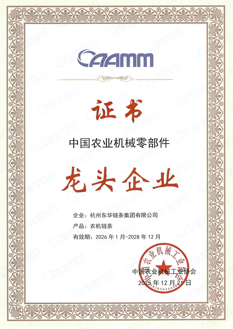 中國農業機械零部件龍頭企業是國內農機零部件領域極具權威性的行業榮譽。東華鏈條自2016年以來,已連續多年獲此殊榮,彰顯了企業在農機傳動領域的持續領先地位。