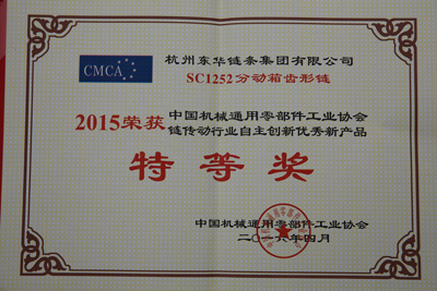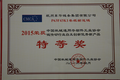 中國機械通用零部件工業協會鏈傳動分會為鼓勵各鏈條制造企業加強自主創新,不斷研制新產品,每年評比表彰一批各企業自主創新的產品。東華集團每年均有一批自主創新新產品問世,這些新產品不斷推動了中國鏈傳動行業持續發展壯大。東華集團被中國機械通用零部件工業協會鏈傳動分會授予2015中國機械通用零部件工業協會鏈傳動行業自主創特等獎的是SC1252分動箱齒形鏈、P63F43K1卷紙輸送鏈、HV4TT汽車生產線用雙節距齒形鏈;被授予優秀獎的是C2062H ORSD帶密封圈農機鏈和P47.25/55.75F1一次成型內單節農機鏈。